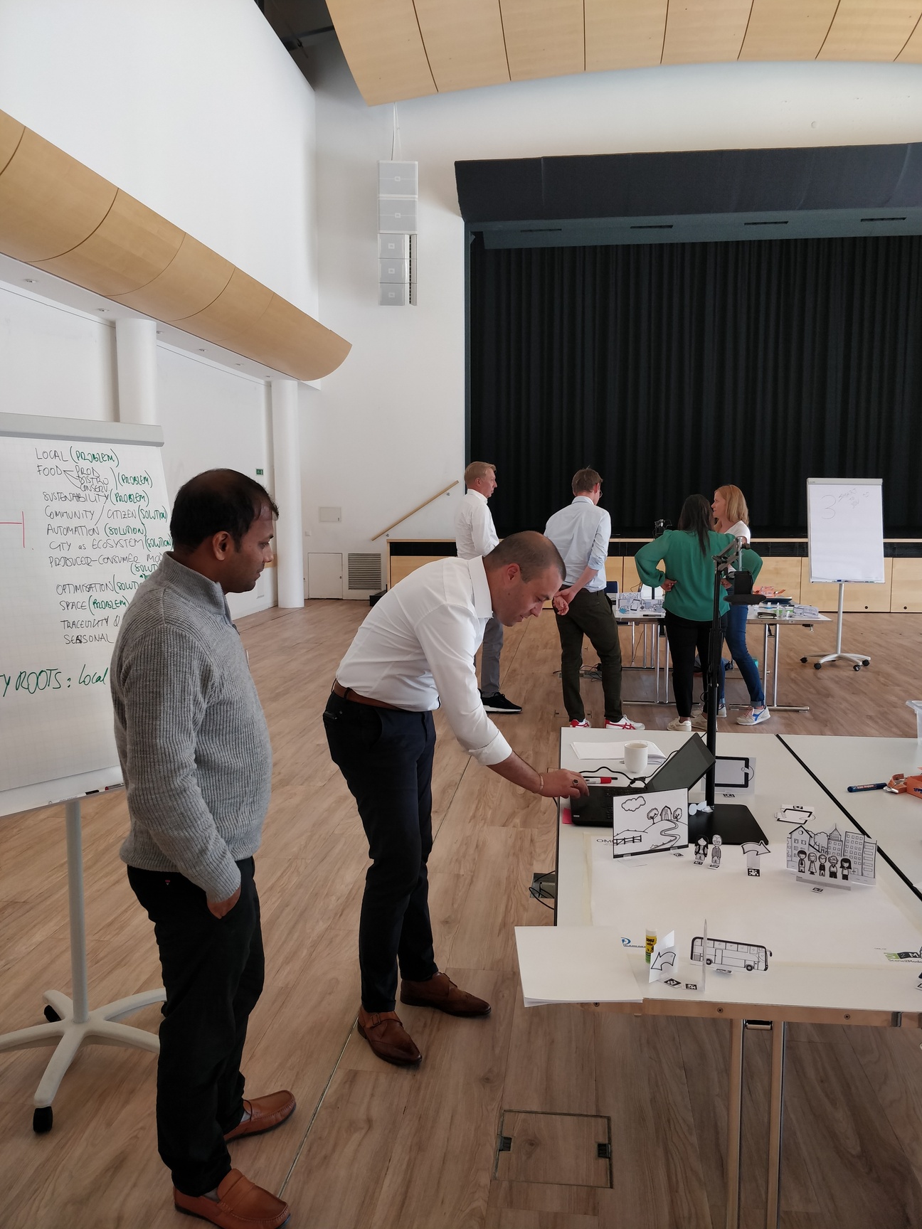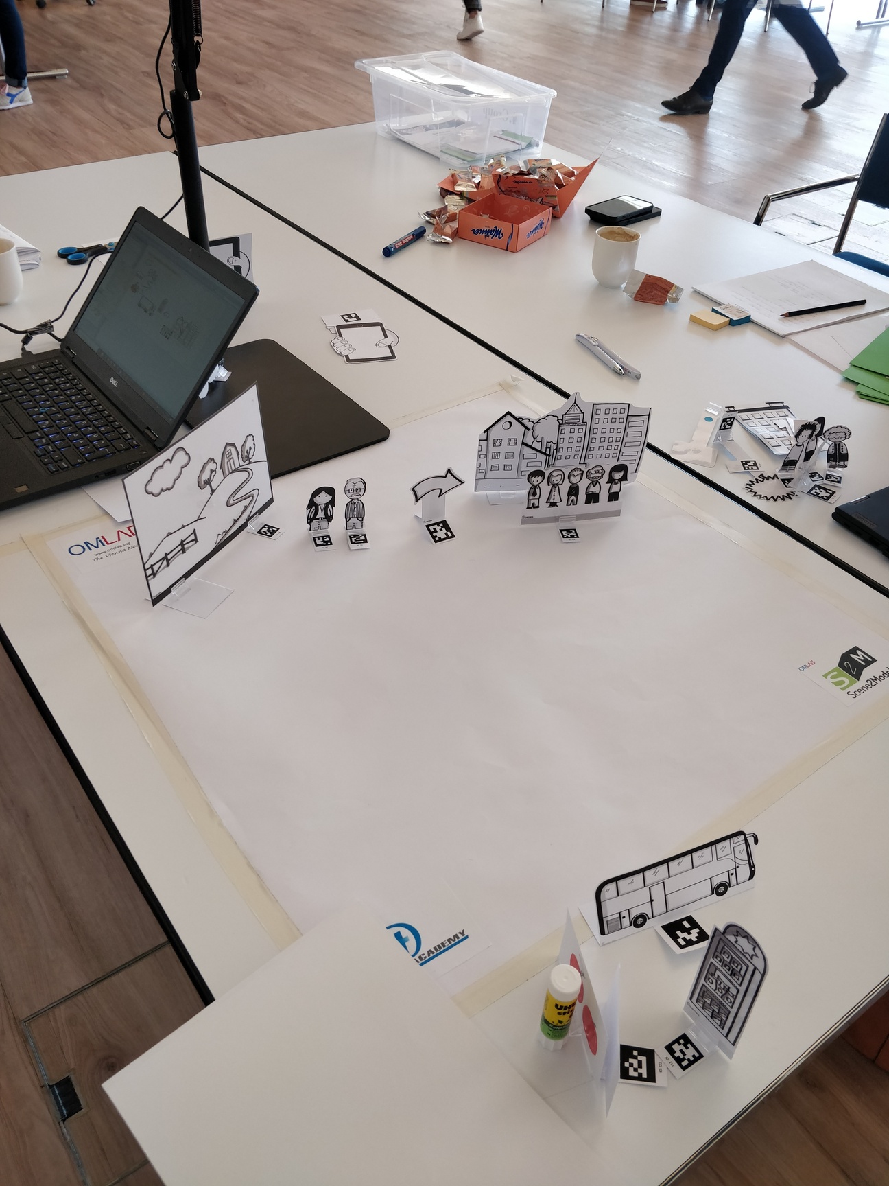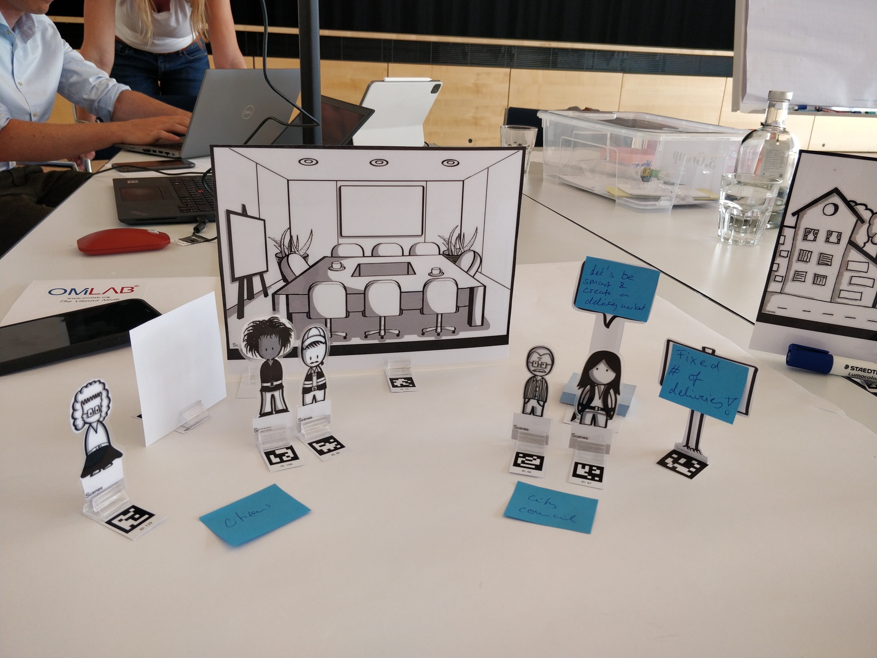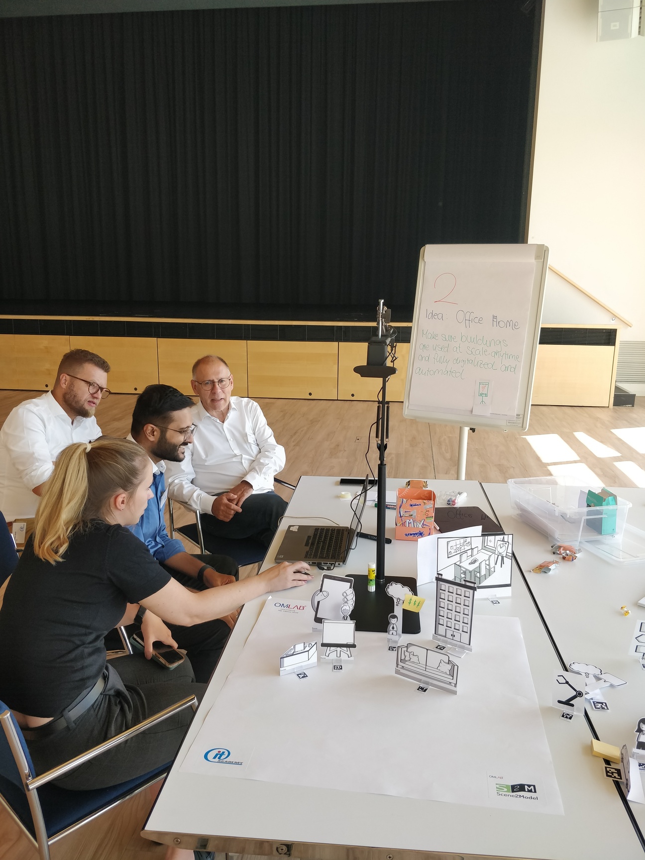 The workshop will introduce participants to storyboards as a selected Design Thinking method. Haptic paper figures (SAP ScenesTM) are used to depict scenes and build storyboards in the context of Smart City domain. Participants will observe the end-to-end process of a tool-supported transformation from haptic paper objects into digitized models. The Scene2Model tool supports design thinking by allowing the creation and processing of digital models of innovative ideas. Additional added value comes from one of the core capabilities which supports the usage of physical co-creation in workshops and deriving enriched digital models automatically from such workshops.